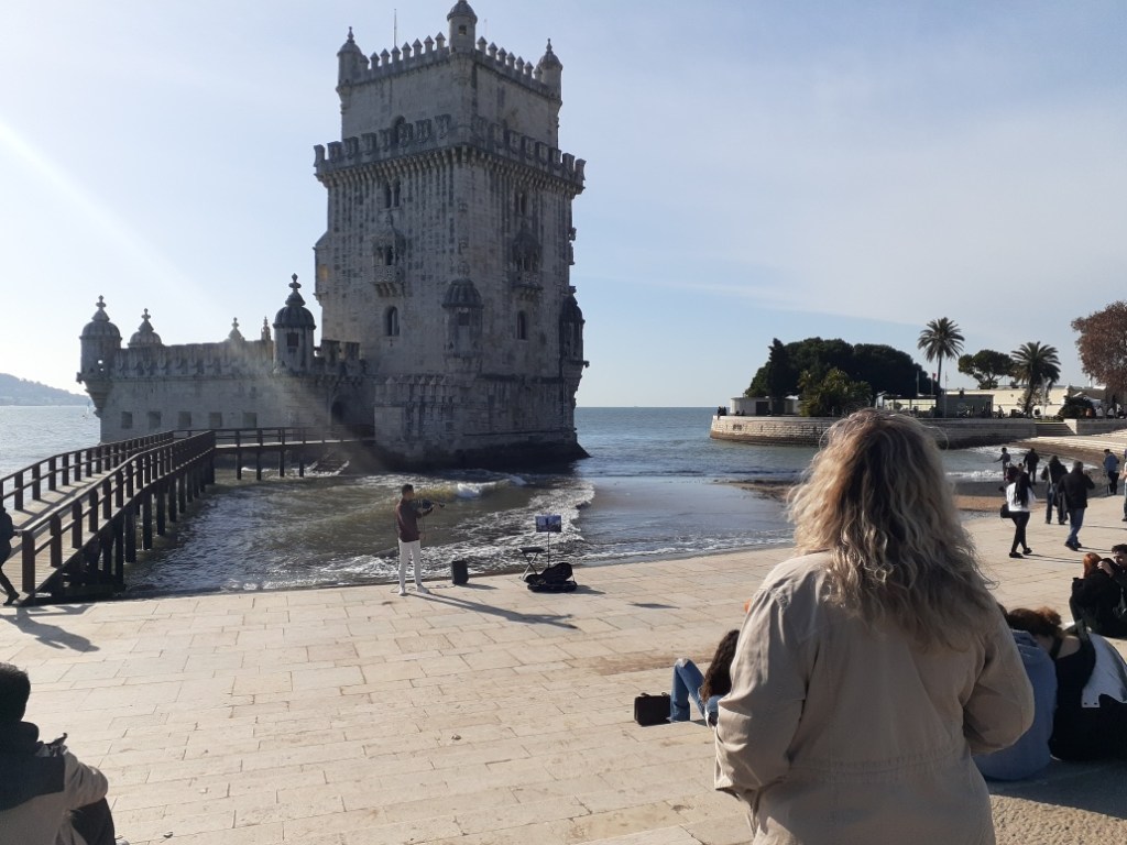 A short walk through a lovely park led us to Belém Tower. I have to admit I hadn’t been all that excited about seeing a military tower, but I was taken by surprise when we arrived. A young man was playing the violin as the gentle waves kept time behind him. The tower (surprisingly to me) sat just in the water and was a sight to behold. We’d read that it was one of the only structures to survive the 1755 Lisbon earthquake and there was a certain elegance to its straightforward architecture. I don’t know why, but I didn’t want to leave for quite a few minutes. Shamefully, I am sometimes bored by sites with historical significance, but not so this time. Maybe it was the violin and the metronomic waves, maybe the lovely, fresh, cool air, maybe the sturdy and enduring building itself. Who knows and it doesn’t much matter, except that it occurred to me that I might be more open-minded to this kind of sightseeing in the future.