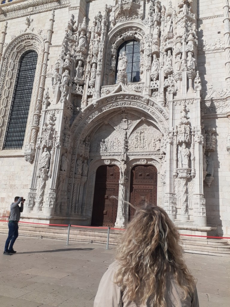 After our indulgence, we decided to walk around a bit and see the sights. David was interested in seeing the tower and I wanted to see the Monument to Discoverers. We walked along the street outside, which wasn’t huge, but wasn’t nearly as narrow and crowded as those we’d walked in Lisbon. The first impressive building we came across was Igregia Santa Marie de Belém. We paused to take in the architecture and saw that visitors were allowed inside, so we tried to go in to take a look. Unfortunately, we were wearing the wrong type of masks and were turned away. On to Belém Tower!