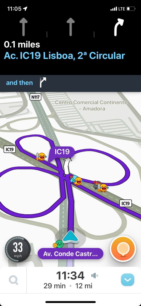 The day after enjoying an amazing dinner in Lisbon, we picked up our rental car and headed to Coimbra. We were both a little nervous about driving in the city, but we got on the road without too much trouble. That is, not too much trouble once we made it through a confusing slew of rotundas. I navigated while David drove, but I have to admit that several times he asked, “This way?”and I responded with a frustrated, “I have no idea!” This may have given him some misgivings about me navigating throughout the entirety of our trip, but later I showed him the screenshot below and we both laughed. At one point, I wondered if the GPS was just messing with me, but, nope. That really was the way to get where we were going.