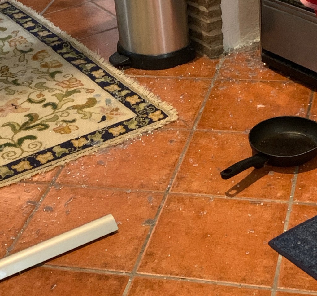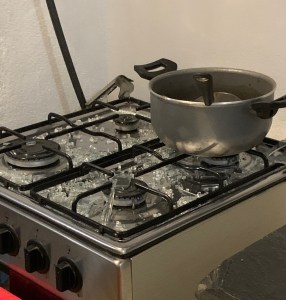 On with the story. I’d made Beef Bouguignon for dinner on Christmas and we had decided to heat it and some bread up for an easy-peasy, delicious dinner. I told David I was going to reheat it on the stove rather than the microwave, because I just like the way it heats better. Am I going into too much detail here? Maybe, but you’ll understand why in a minute. While the bourguignon warmed on the glass-topped gas stove, I buttered the bread and put it in a pan on the stove to warm and soften. Things were going along swimmingly. Soon we had dished up our dinners and moved to the little living room to eat. After moving the rug out of the way, because we wanted to be sure not to damage it, we dug in. And that’s when it happened. From the kitchen to our left, we heard an explosion and glass shattering. Looking over, we saw that the stove’s glass top had shattered, and the glass, the metal rim that had framed the glass, and the pan that had warmed the bread had been thrown across the width of the kitchen.